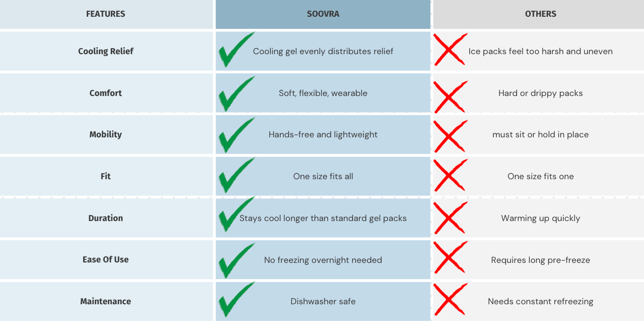 Soovra brings cooling comfort with gentle pressure, without needing to pause your day. No hassle, no freezing overnight — just wearable relief when your mind needs quiet.